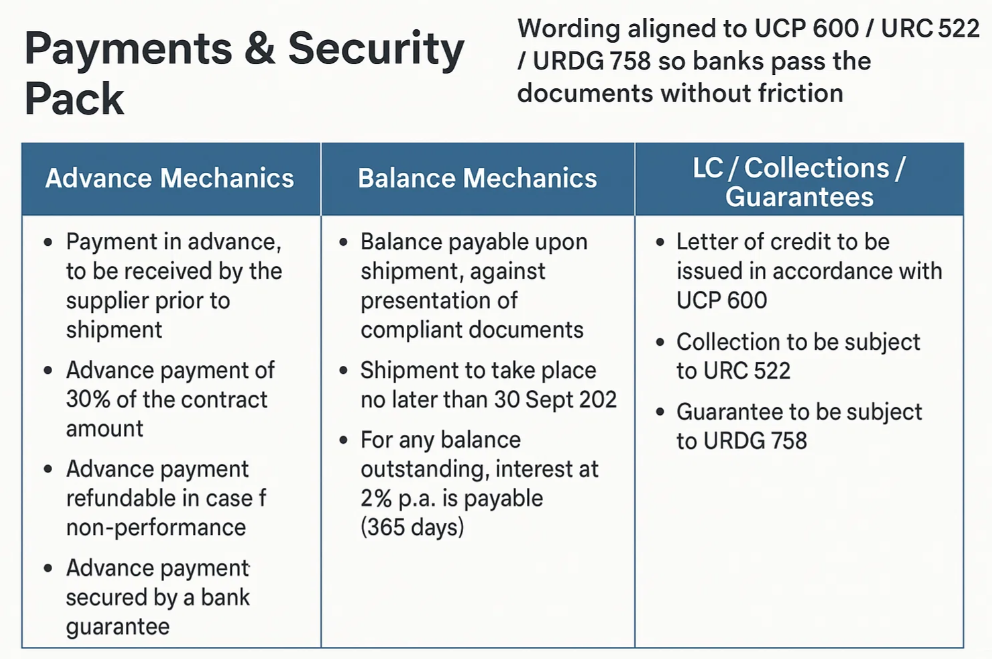 - Payments & Security Pack – advance/balance mechanics, LC/collections/guarantees wording aligned to UCP 600 / URC 522 / URDG 758 so banks pass the documents without friction.