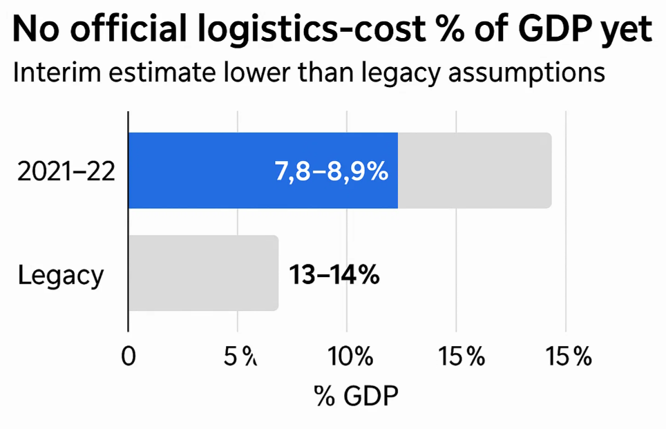 – Parliament recently noted no official logistics-cost % of GDP yet (study underway with NCAER), while an interim DPIIT/NCAER assessment estimates 7.8–8.9% of GDP (2021–22) — lower than legacy 13–14% assumptions that some suppliers still use to justify surcharges.