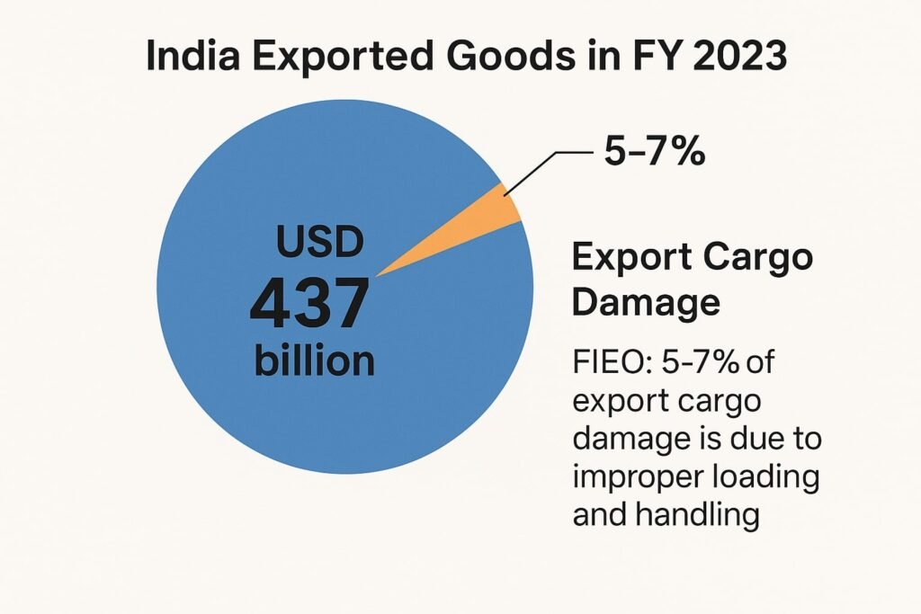 - India exported goods worth USD 437 billion in FY 2023, and FIEO (Federation of Indian Export Organisations) reports that 5–7% of export cargo damage is due to improper loading and handling.
